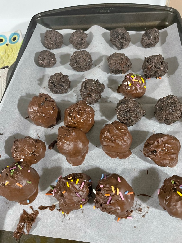 S’mores Bars! These turned out pretty good, I find they taste the best at room temperature or after being heated up in the microwave for 15 seconds. Gingerbread Bars! I was honestly so happy with the cream cheese frosting, it tasted so delicious, the bars also taste amazing. Could be eaten cold, room temperature or heated. Originally I was supposed to use Christmas sprinkles for the Gingerbread bars, however, the grocery stores I went to did not have any Christmas themed sprinkles. Oreo Balls! Originally half was supposed to be coated with milk chocolate, and the other half was supposed to be white chocolate. I had a chocolate melting malfunction and they did not turn out how they were supposed to, nevertheless, the actual Oreo Balls tasted great, almost like Oreo Cheese cake! They tasted good even without the chocolate coating, but, the chocolate coating does make it look nicer.