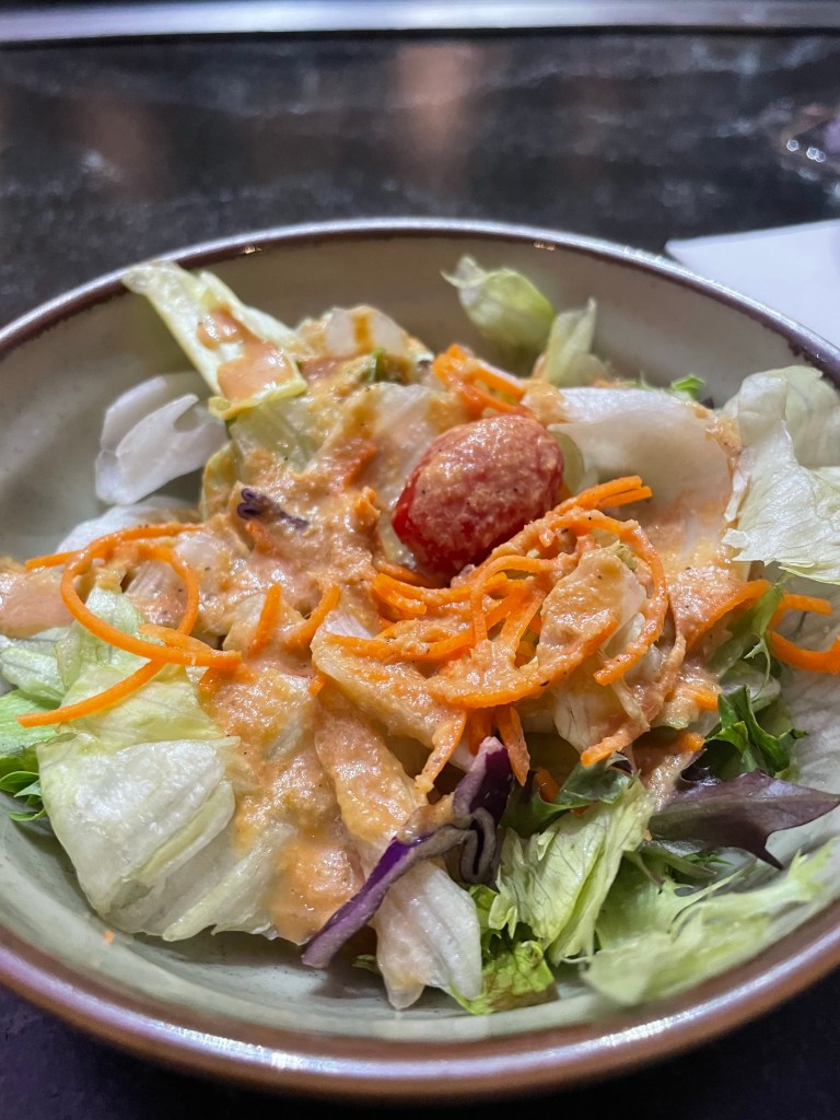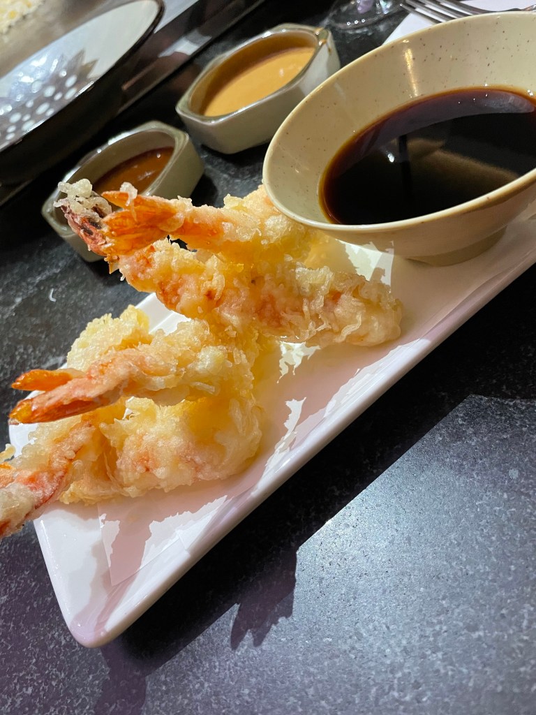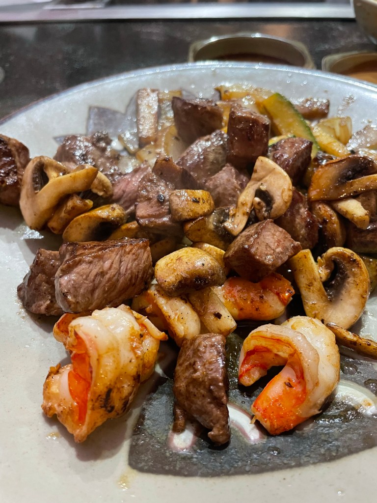 There is a table that fits approximately 8 people, chances are you end up sitting with random people. There is a grill in the centre, where the chef will entertain you and cook your food right in front of you.