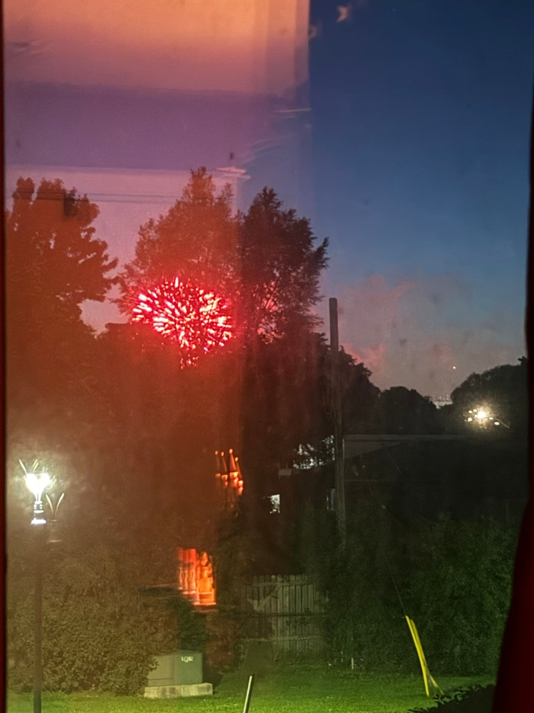 While I was putting my daughter to bed, I was able to see the fireworks from her bedroom window. Was hard to see them because of the trees, but these are the ones we would’ve seen at the park.