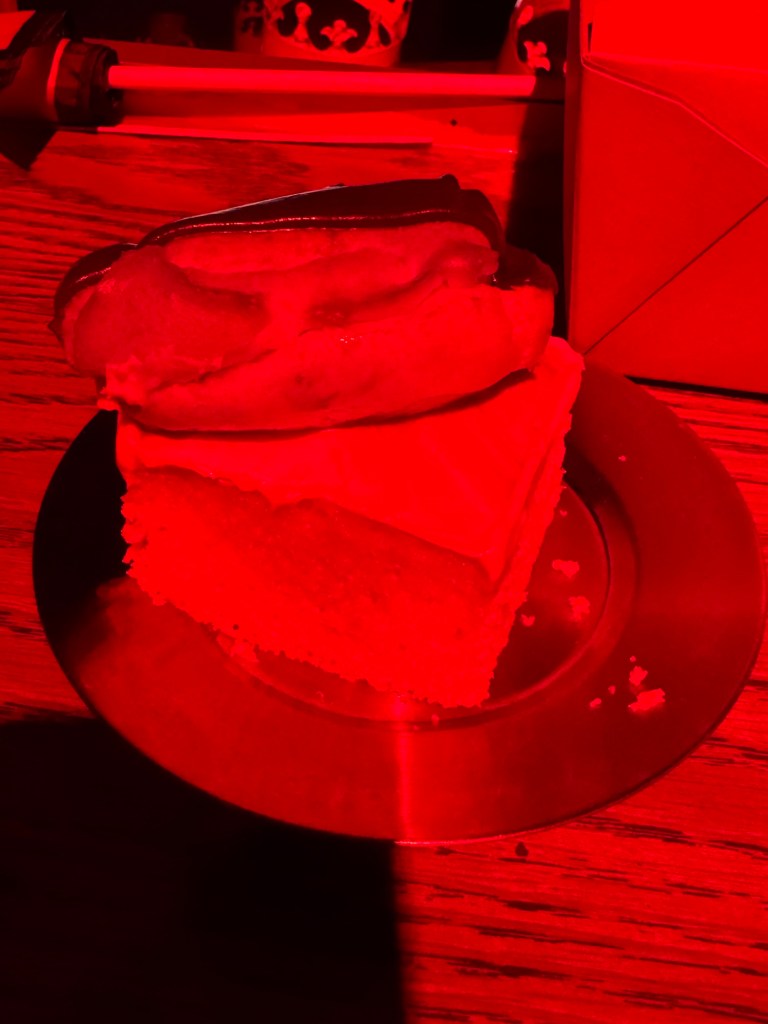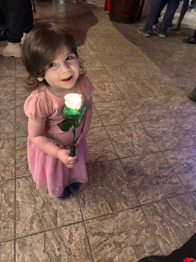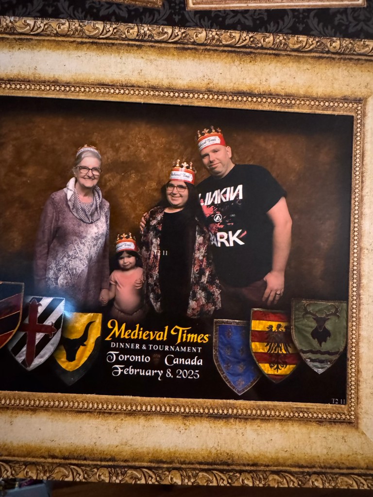 The weather was good driving on the way there, driving back home however was snowing quite a lot (don’t have an after photo). I absolutely love horses. And I of course needed a selfie with one. We went home with some souvenirs. The light up rose for my daughter and I was one of them. I got a wooden sword. We both got flags and my Husband came home with a dagger. the merch was all reasonably priced. I was always told that it’s a lot of food. But, considering the menu and the quality of the entertainment, I can 100% understand the pricing to get in. It looks so cool with the fog and the photo was pretty cool. Just had to share with you all. Our Knight was the red Knight. There was some entertainment with just the horses, which was awesome. They can even bow! Didn’t get to take a photo of the soup, I devoured mine before I even considered a photo. So here you can see some of my daughter’s soup lol. Again, I decided to dig in before taking a photo. The chicken was delicious and so was the corn. The potato was a little on the dry side, but still good. Dessert was the Eclair, they happened to have two pieces of cake left, so my daughter and I got one each. If I’m being completely honest, the cake was better than the Eclair. Could be because I’m not actually a fan of Eclair’s, or, it could be that I’m obsessed with cream cheese frosting.. and that was what was on the cake. And of course I wanted a copy of the family photo as a memory. My Mother-in-Law, my daughter, myself and my Husband in that order.